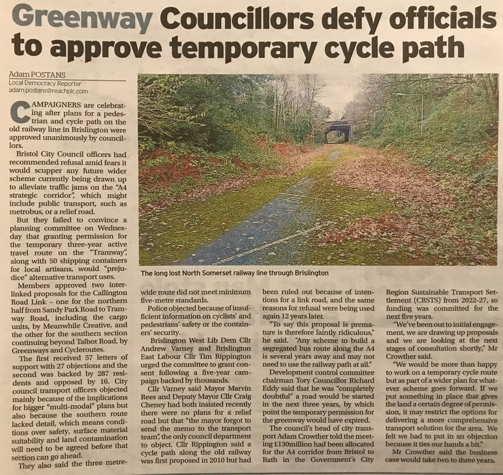 A Bristol City Council planning committee has given the green light to the new route despite concerns from council officers. The Greenways section is the southern part, a 1km long section of path along the old railway line that would link the existing Whitchurch Way to the River Avon Path and the centre of Bristol. See newspaper extracts below and also the Brislington planning application submission here.