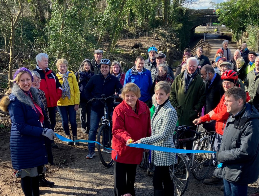 Also, holding the tape on the left is Kelly Knight and on the right, Richard Jones. This event was an opportunity to thank Kelly for all her work to make the Mendip Greenways possible, and who is now taking a well-deserved sabbatical break.