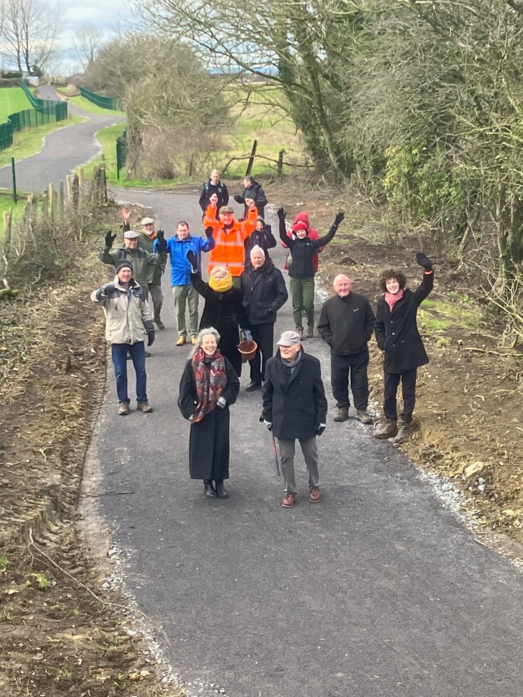 March 10th saw Annie Maw, the former Lord Lieutenant of Somerset lead a group along the newly laid path from the Shepton Mallet Recreation Ground to Ridge Road (900 metres). This railway path is the penultimate section of the Strawberry Line from Yatton to Shepton Mallet. The land has been kindly made available by the Duchy of Cornwall where we have worked closely with their farming tenant.
