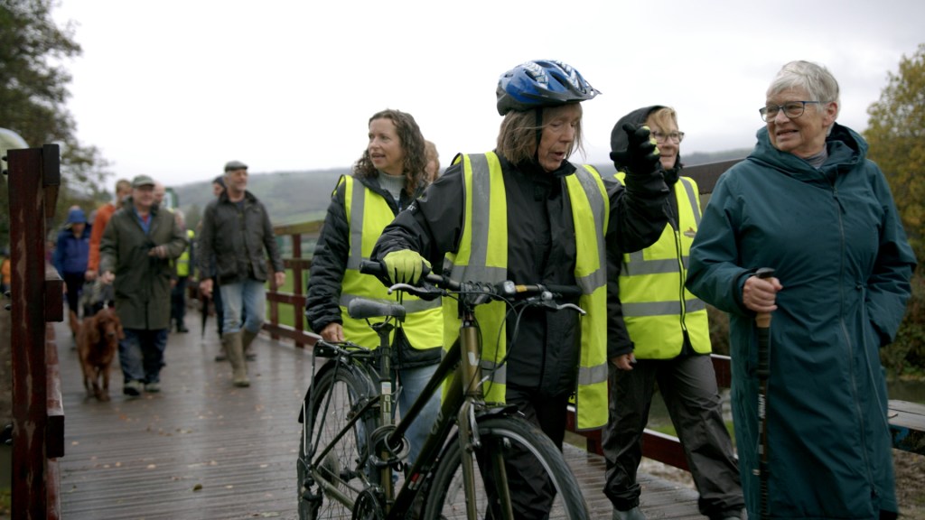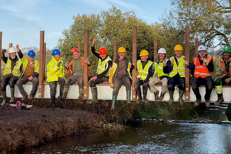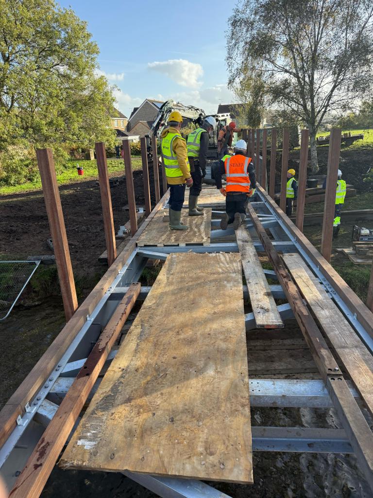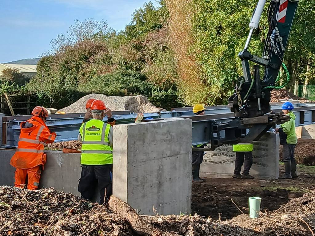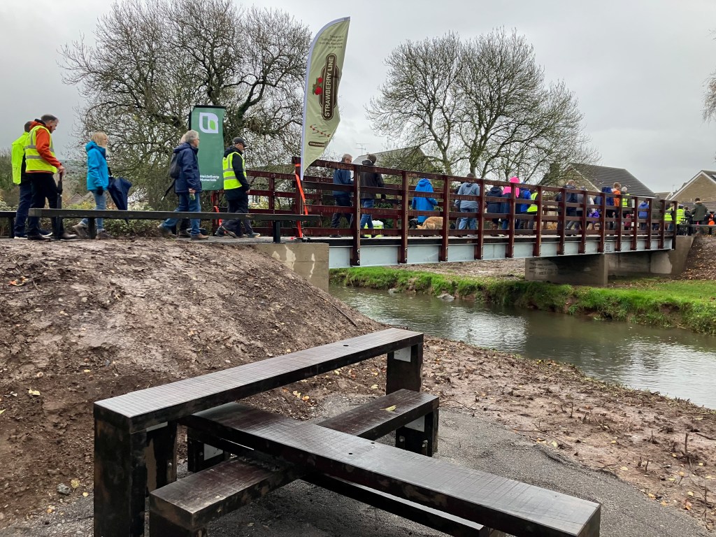 A new route in Cheddar was officially opened on Friday 14 November, as part of the Strawberry Line, and funded by Somerset Council. It has been a team effort. In April, Strawberry Line volunteers fenced off a portion of the Kings Academy playing field, so Greenways contractors could build the route. The reinforcing and shuttering for the bridge supports were built at the Greenways September workcamp in Shepton Mallet, and in October, volunteers from both teams worked together to install the new bridge, which links the Kings Fitness and Leisure centre and the school to the Draycott Park Estate. Part of the planned Somerset Circle, the route provides a much-needed greenway, avoiding the busy A371 and links to Labourham Drove and the route towards Wells.