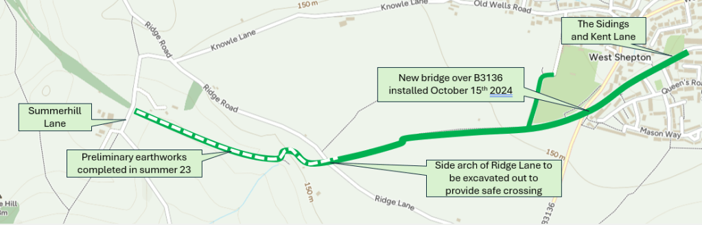 Historic Railway Estate of National Highways own the bridge whose arch under Ridge Road leads the route westwards towards Wells.